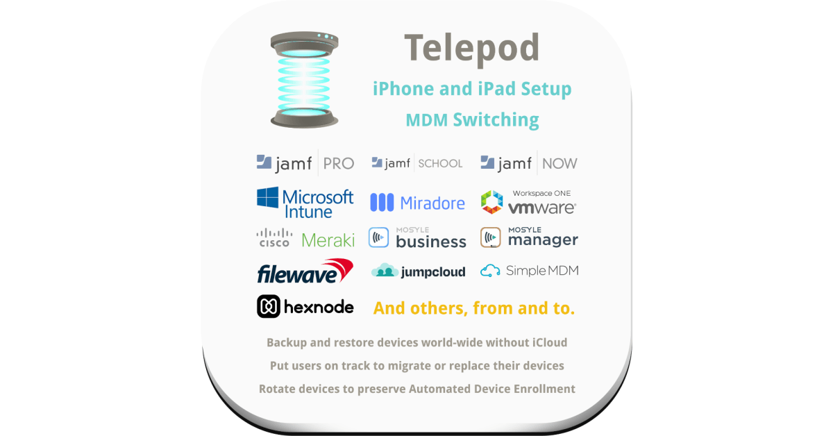 Telepod is an app designed to streamline the lifecycle of managing iOS devices. Without needing to restore from iCloud a new iOS device can be restored from the backup of a device acting as a template or from the backup of a device that needs to be swapped. Telepod can also be implemented as part of a device management solution switching project requiring migrated devices to retain their Automated Device Enrollment configuration as they migrate.