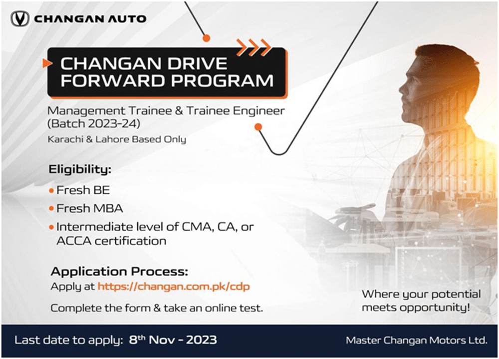 Changan’s Drive Forward Program registrations are open. Prospective candidates can take the online assessment at https://changan.com.pk/cdp for positions based in Karachi and Lahore. Application deadline is 8 November 2023.