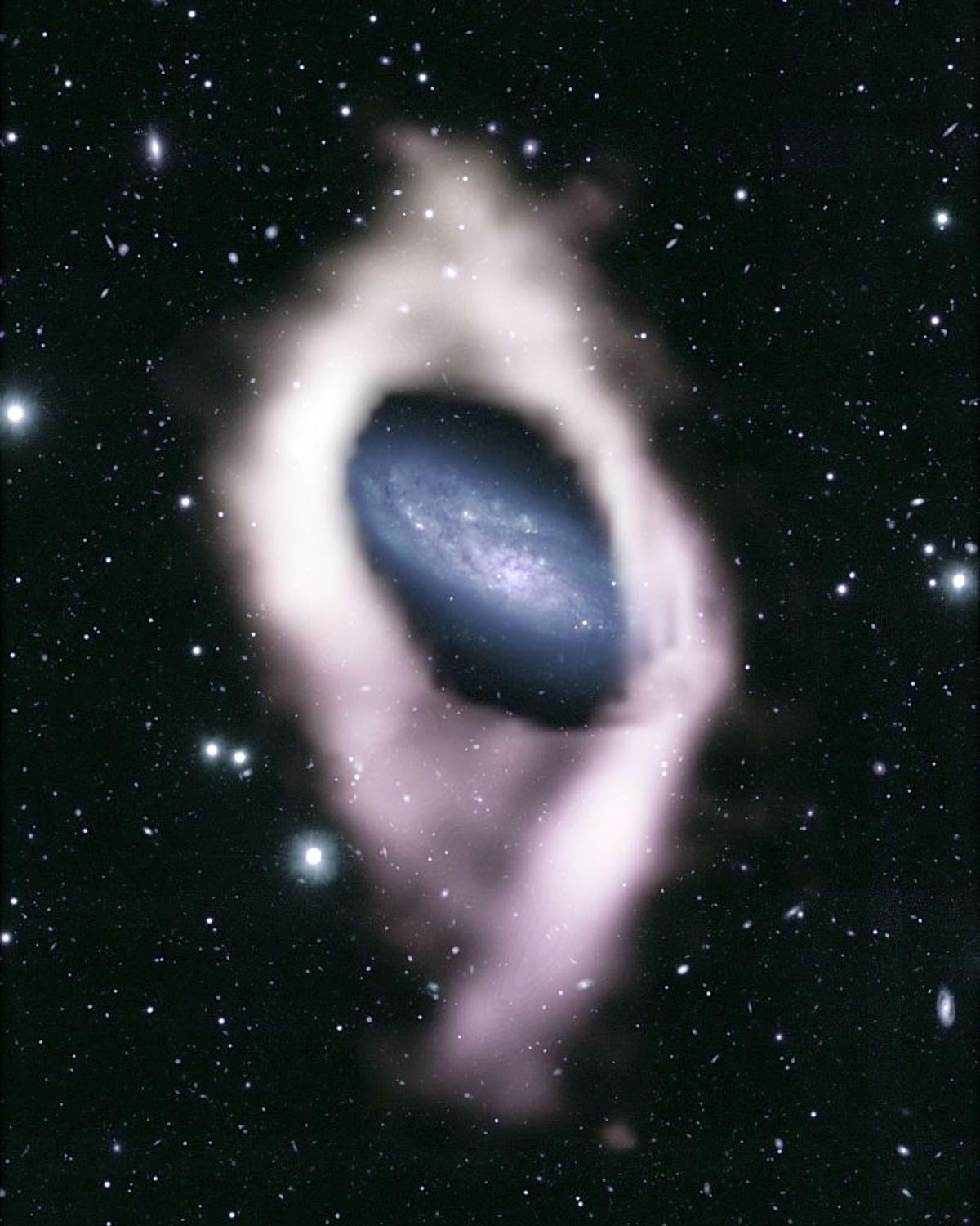 Potential polar ring galaxy NGC 4632. The picture shows a gaseous ring perpendicularly circulating the main spiral disk of the galaxy. Credit: Jayanne English (U. Manitoba), Nathan Deg (Queen’s U.) & WALLABY Survey, CSIRO / ASKAP, NAOJ / Subaru Telescope