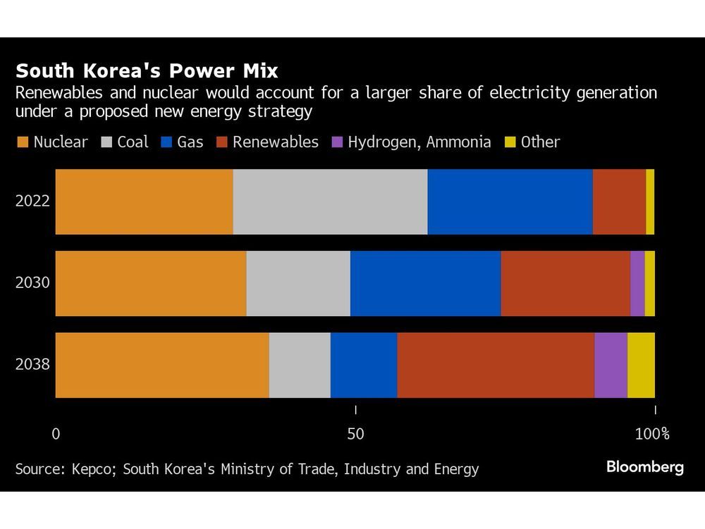 Renewables make up less than 10% of the nation’s power mix. The aim is to double this by the end of the decade and triple it by 2038, but that will still be less than a third of total generation. To meet the gap, President Yoon Suk Yeol’s administration is targeting more nuclear reactors — currently supplying about 30% of the country’s electricity — and wants to retrofit power plants to blend, or co-fire, hydrogen with coal and gas.