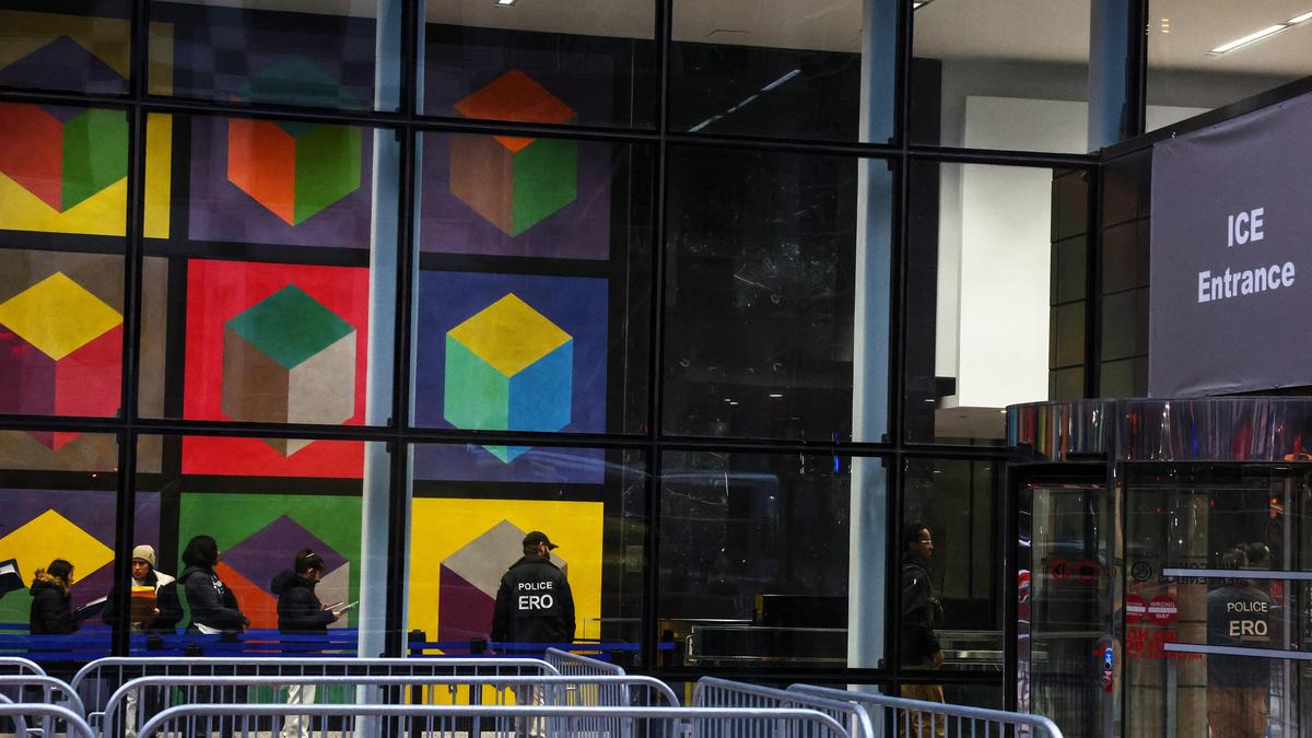 People wait in line to enter the U.S. governmental office building immigration court in New York City, U.S.