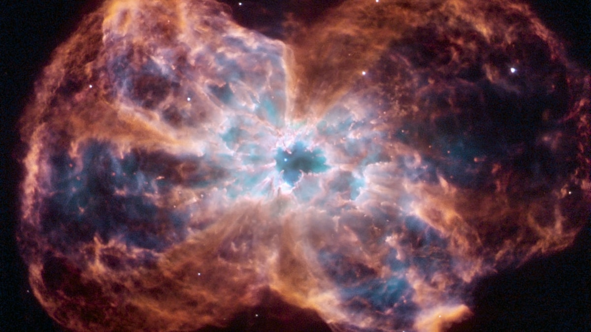 This image, taken by the NASA/ESA Hubble Space Telescope, shows the colorful death of a star similar to our sun. The star is ending its life by casting off its outer layers of gas, which formed a cocoon around the star’s remaining core. Ultraviolet light from the dying star makes the material glow. The burned-out star, called a white dwarf, is the white dot in the center. Our sun will eventually burn out and shroud itself with stellar debris, but not for another 5 billion years. The planetary nebula in this image is called NGC 2440. The white dwarf at the center of NGC 2440 is one of the hottest known, with a surface temperature of more than 360,000 degrees Fahrenheit (200,000 degrees Celsius). NGC 2440 lies about 4,000 light-years from Earth in the direction of the constellation Puppis. The material expelled by the star glows with different colors depending on its composition, its density and how close it is to the hot central star. Blue samples helium; blue-green oxygen, and red nitrogen and hydrogen.